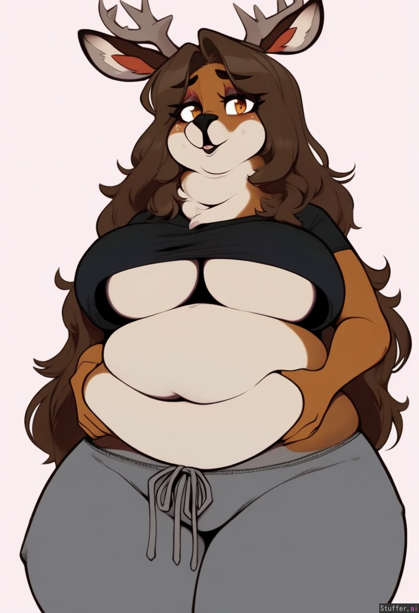 Amazing quality, High Rating, high definition, HD, defined outlines, flat color, anime art style, beautiful_eyes, sharp shadows, vibrant lighting, furry, anthro, anthro doe, deer species, loose baggy midriff underboob shirt, shirt wrinkles, breasts, low-cut baggy gray sweatpants, long hair, spotted brown fur, white belly, exposed_midriff, shy, cute face, underboob_exposed, fat belly, wide hips, holding_belly, fat neck, fat cheeks