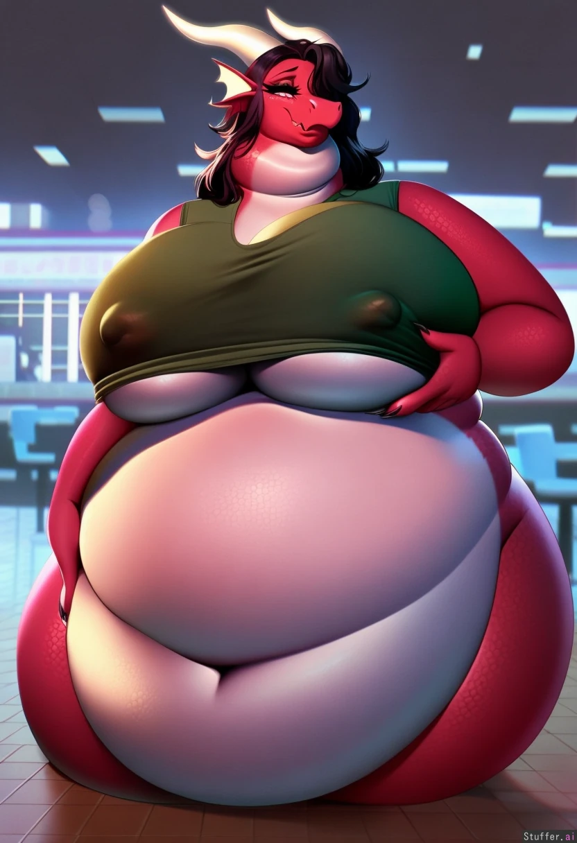 best quality, high rating, Amazing quality, High Rating, high definition, HD, defined outlines, anime art style, beautiful_eyes, sharp shadows, vibrant lighting, furry, anthro, anthro dragon, dragon species, loose baggy midriff underboob shirt, shirt wrinkles, breasts, bottomless, long hair, red scales, white belly, exposed_midriff, shy, cute face, underboob_exposed, belly_on_the_floor, obese belly to the floor, wide hips, holding_belly, fat neck, chubby cheeks, diner background, nipple outline