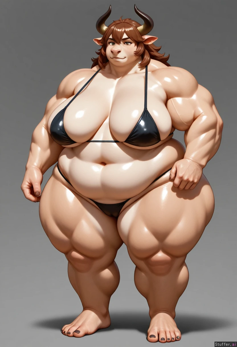 semi-anthro_oxen_woman, buff_hyper_thicc_obese_body, full_thick_middle, massive_muscles, enormous_thighs, enormous_calfes, thick_legs, thick_arms, thick_hips, semi_photorealistic