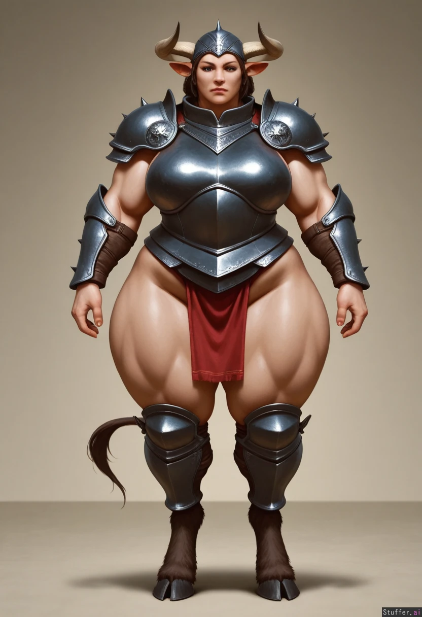 Beautiful, female_semi-anthro_ox_woman, buff_hyper_thicc_obese_body, full_thick_middle, massive_muscles, enormous_thighs, enormous_calfes, thick_digitigrade_legs, hooves, thick_arms, thick_hips, semi_photorealistic, fantasy_armour,