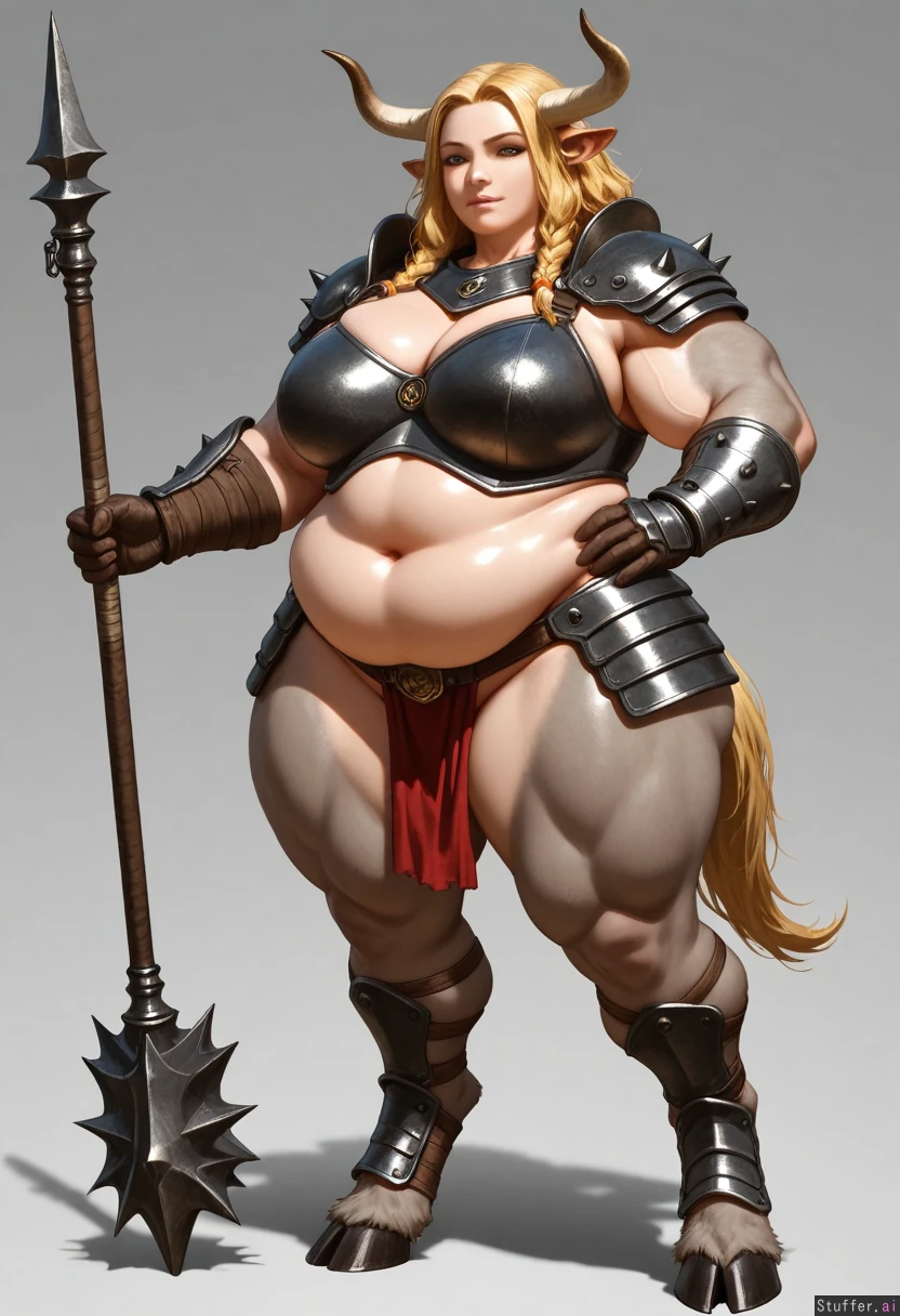 Beautiful, female_semi-anthro_ox_woman, buff_hyper_thicc_obese_body, full_thick_plump_middle, massive_muscles, enormous_thighs, enormous_calfes, thick_digitigrade_legs, hooves, thick_arms, thick_hips, semi_photorealistic, fantasy_bronze_armour, one_hand_on_belly one_hand_holding_large_mace