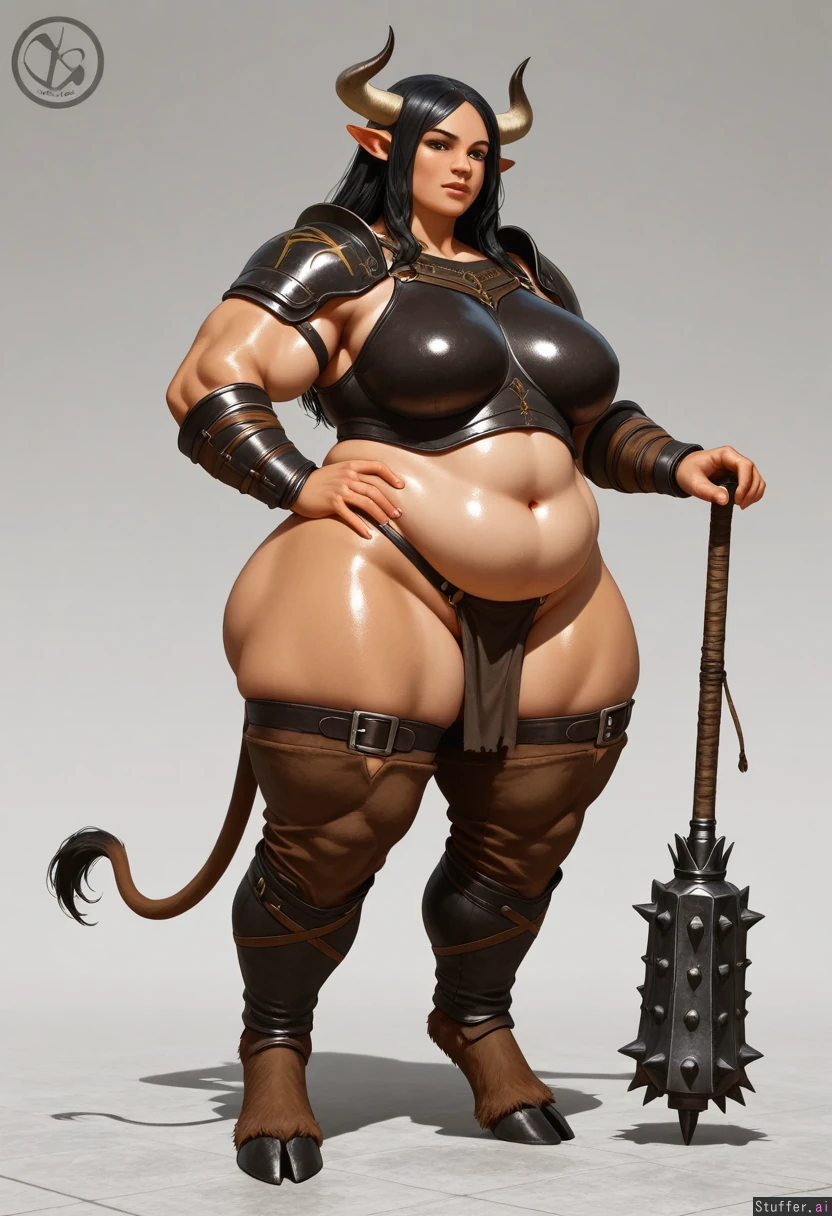Beautiful, female_anthro_ox_woman, black_hair, brown_fur, buff_hyper_thicc_obese_body, full_thick_plump_middle, big_fat_belly, massive_muscles, enormous_thighs, enormous_calfes, thick_digitigrade_legs, hooves, thick_arms, thick_hips, medium_breasts, semi_photorealistic, fantasy_leather_armour, one_hand_on_belly one_hand_holding_large_mace, jungle_temple