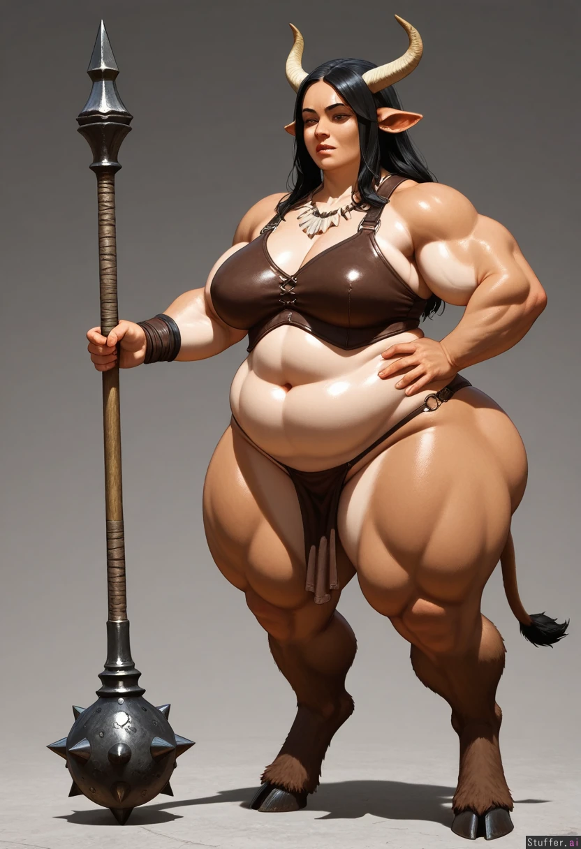 Beautiful, female_anthro_ox_woman, black_hair, brown_fur, buff_hyper_thicc_obese_body, full_thick_plump_middle, big_fat_belly, massive_muscles, enormous_thighs, enormous_calfes, thick_digitigrade_legs, hooves, enormous_ass, thick_arms, thick_hips, medium_breasts, semi_photorealistic, fantasy_leather_armour, one_hand_on_belly one_hand_holding_large_mace, jungle_temple