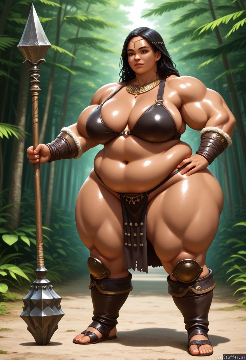 Beautiful, indian_woman, black_hair, brown_skin, buff_hyper_thicc_obese_body, full_thick_plump_middle, big_fat_belly, massive_muscles, enormous_thighs, enormous_calfes, thick_legs, enormous_ass, thick_arms, thick_hips, medium_breasts, semi_photorealistic, fantasy_leather_armour, one_hand_on_belly one_hand_holding_large_mace, jungle_temple