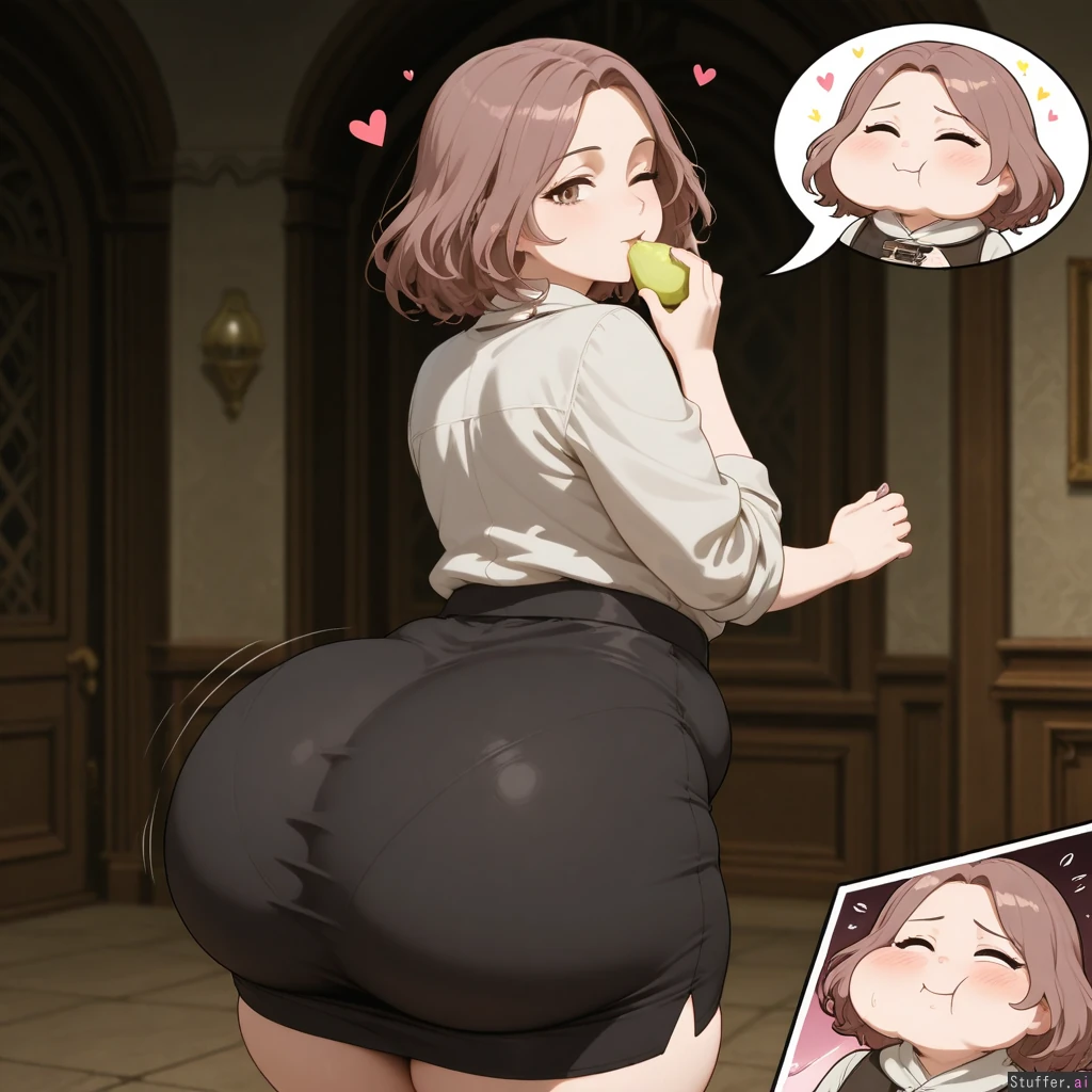 Melina (Elden Ring), her left eye closed, highly detailed, cinematic, loves you, happy, digital art, eating ,getting fat fat_ass, gluttony , secretary, pencil_skirt, ass expansion, chubby, hyper ass, wide hips, chubby_belly, wobbling ass cheeks, seductive, pear-shaped_figure