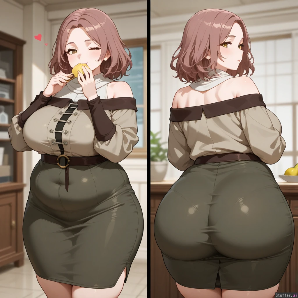 Melina (Elden Ring), her left eye closed, highly detailed, cinematic, loves you, happy, digital art, eating ,getting fat fat_ass, gluttony , secretary, pencil_skirt, ass expansion, chubby, hyper ass, wide hips, chubby_belly, wobbling ass cheeks, seductive, pear-shaped_figure, hips_wider_than_shoulders, gigantic_ass