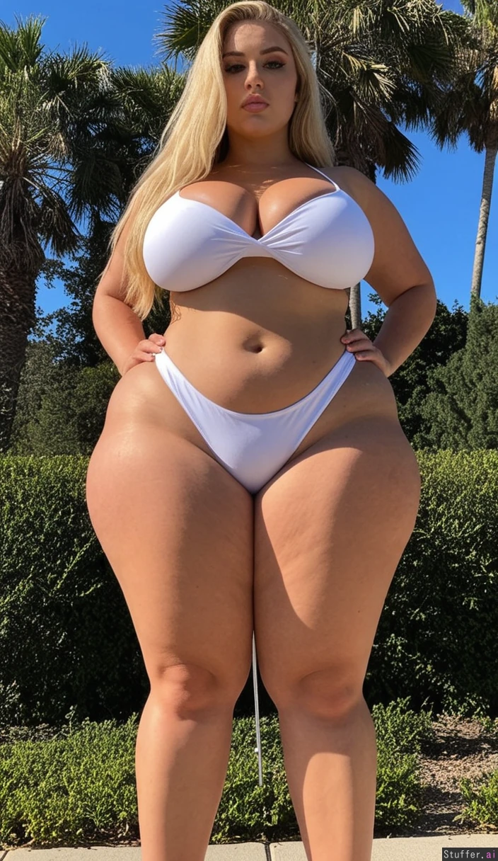 Woman standing outside alone ((Very tall, extra long legs): 1.2) (Very long blonde hair) (Very Tan skin) Green eyes ((Massive Curvy wide hips: 1.4)) ((Massive thick thighs: 1.1)) (Slim waist, belly showing, thick body) Perfect fitting tight white bikini Full body view