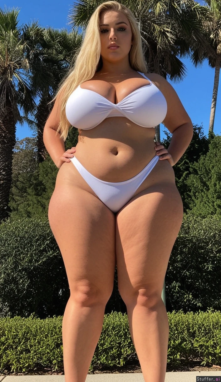 Woman standing outside alone ((Very tall, extra long legs): 1.2) (Very long blonde hair) (Very Tan skin) Green eyes ((Massive Curvy wide hips: 1.4)) ((Massive thick thighs: 1.1)) (Slim waist, belly showing, thick body) Perfect fitting tight white bikini (Full body view)