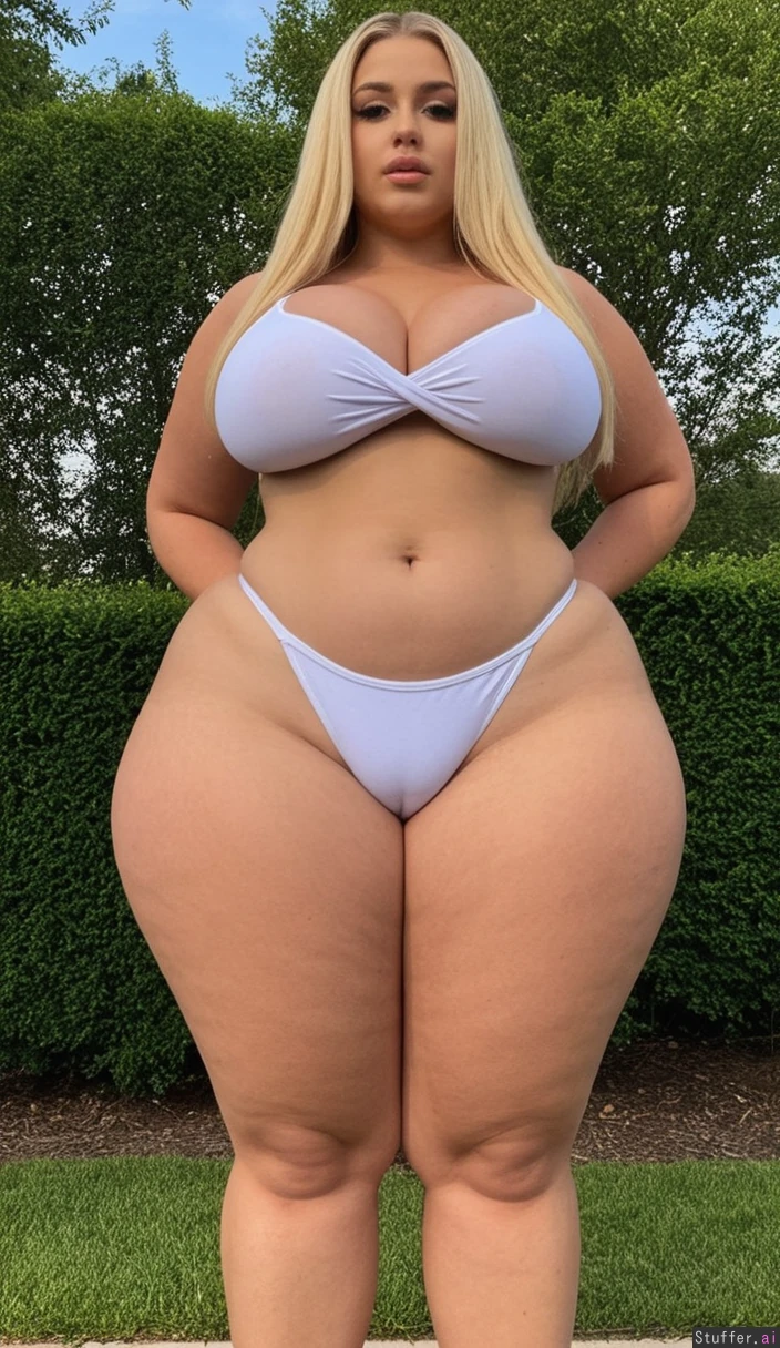 Woman standing outside alone ((Very tall, extra long legs): 1.2) (Very long blonde hair) (Very Tan skin) Green eyes ((Massive Curvy wide hips: 1.8)) ((Massive thick thighs: 1.2)) (Slim waist, belly showing, thick body) Perfect fitting tight white bikini (Full body view)
