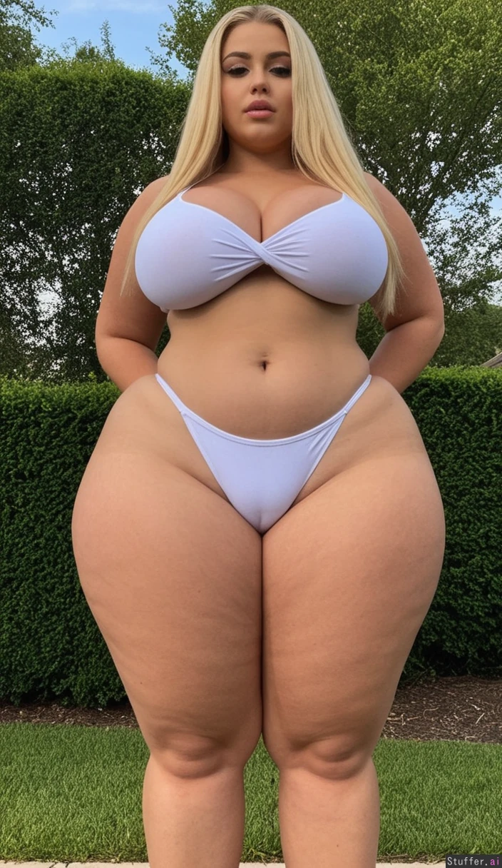 Woman standing outside alone ((Very tall, extra long legs): 1.2) (Very long blonde hair) (Very Tan skin) Green eyes ((Massive Curvy wide hips: 1.8)) ((Massive thick thighs: 1.2)) (Slim waist, belly showing, thick body) Perfect fitting tight white bikini (Full body view) ((Extra wide hips))