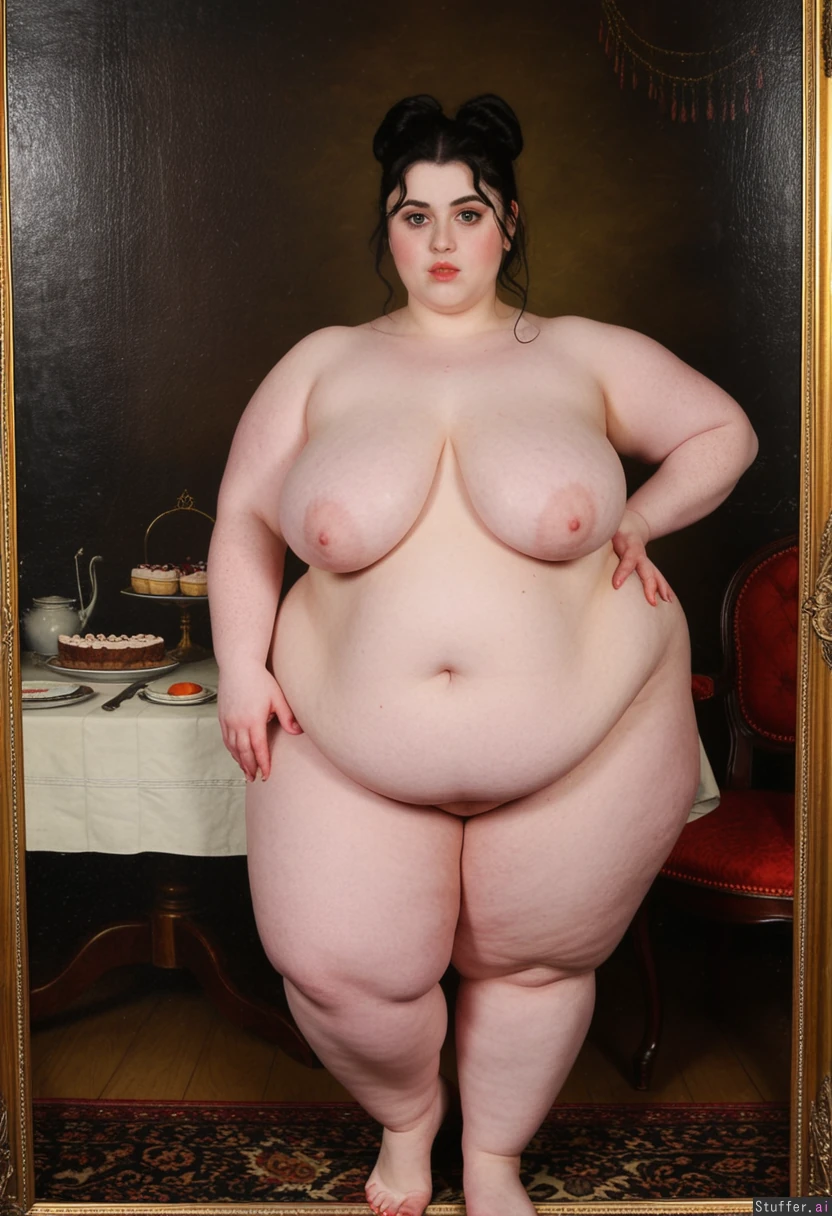 beautiful pale skin woman in her twenties. Real face. Black hair. big eyes, and a large hook nose. 19th century painting, luxurious surroundings, many desserts. cleavage. fat, thick waist, wide chubby hips Large breasts. Full body Fully nude Perfect feet Skinny face