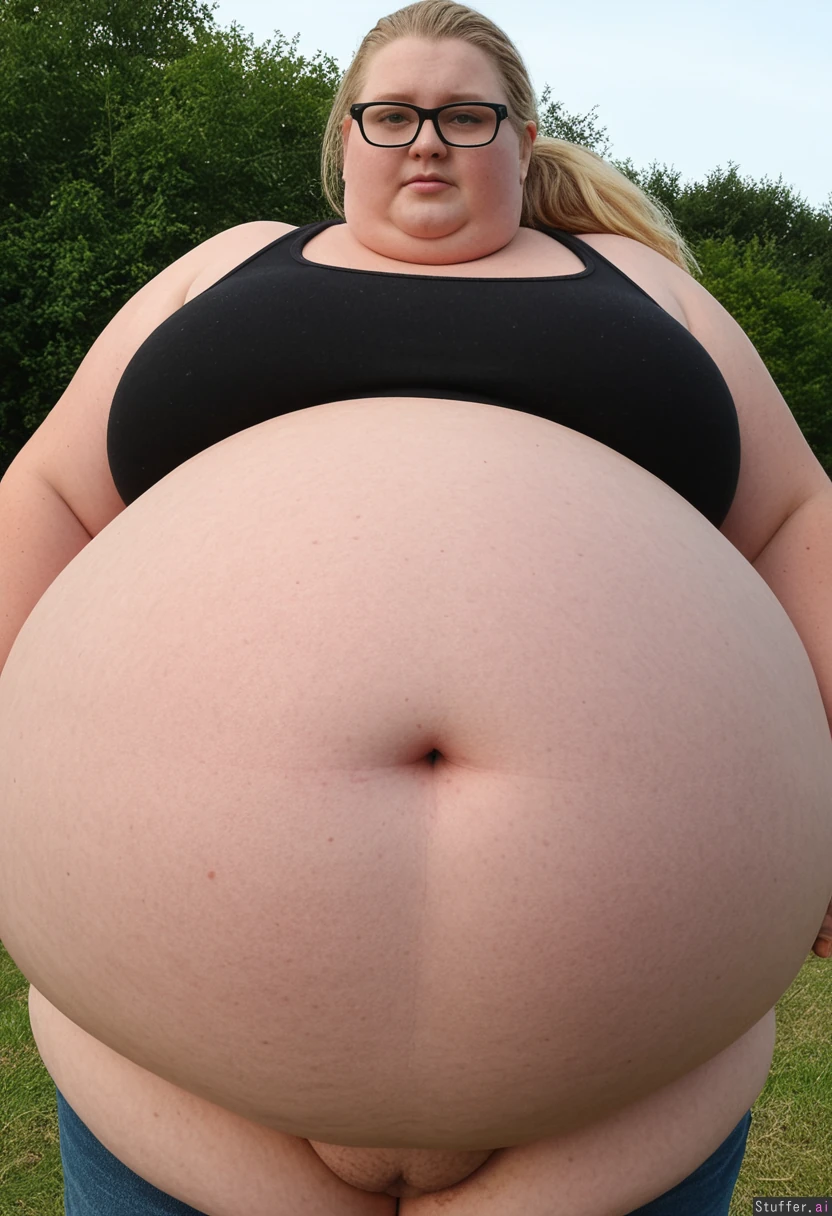 (Hyper Obese:3.0) woman with Huge Belly; Belly Hangs over Knees; Long blonde Ponytail Glases, model Face, double chin Standing with fields in background Wearing highwaisted Jean; Belly in jean and black tank top with cleavage showing, wide hips, immobile fat round ball belly:, ussbbw_belly:, (gaint blob of a woman:1.9)
