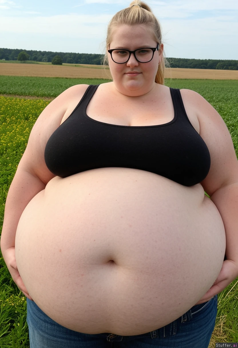(Hyper Obese:1.0) woman with Huge Belly; Belly Hangs over Knees; Long blonde Ponytail Glases, model Face, double chin Standing with fields in background Wearing highwaisted Jean; Belly in jean and black tank top with cleavage showing, wide hips, immobile fat round ball belly:, ussbbw_belly:, (gaint blob of a woman:1.4)