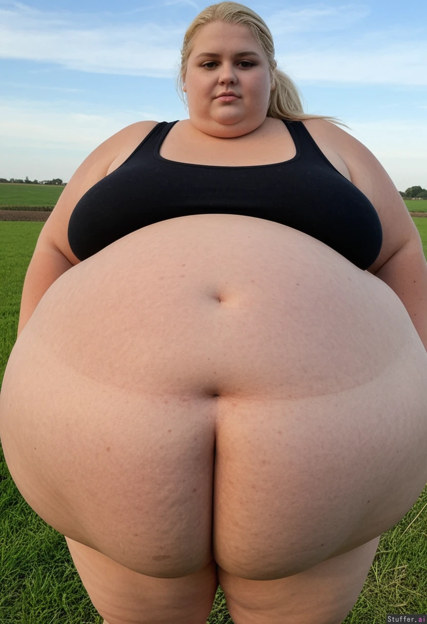 (Hyper Obese:2.3) woman with super fat curvy body and (small breasts) Long blonde Ponytail Standing with fields in background Wearing black thong and black tank top with cleavage showing, (wide hips:), (fat belly:), (gigantic_belly:), (gaint blob of a woman:1.7)