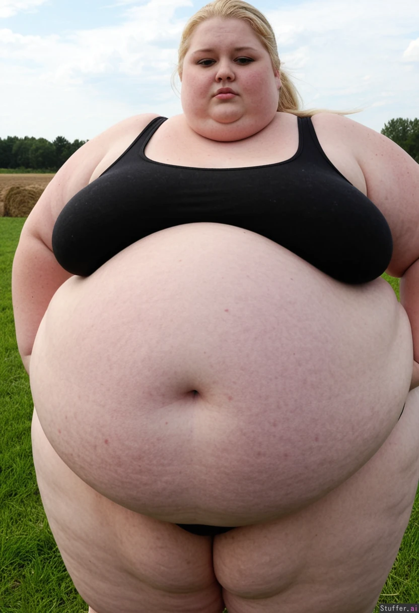 (Hyper Obese:2.4) woman with super fat curvy body and (small breasts) Long blonde Ponytail Standing with fields in background Wearing black thong and black tank top with cleavage showing, (wide hips:), (fat belly:), (gigantic_belly:), (gaint blob of a woman:1.0)