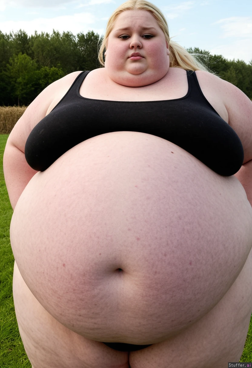 (Hyper Obese:2.7) woman with super fat curvy body and (small breasts) Long blonde Ponytail, Model Face Standing with fields in background Wearing black thong and black tank top with cleavage showing, (wide hips:), (fat belly:), (gigantic_belly:), (gaint blob of a woman:1.0)