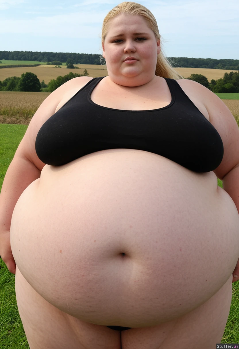 (Hyper Obese:2.0) woman with super fat curvy body and (small breasts) Long blonde Ponytail, Model Face Standing with fields in background Wearing black thong and black tank top with cleavage showing, (wide hips:), (fat belly:), (gigantic_belly:), (gaint blob of a woman:1.5)