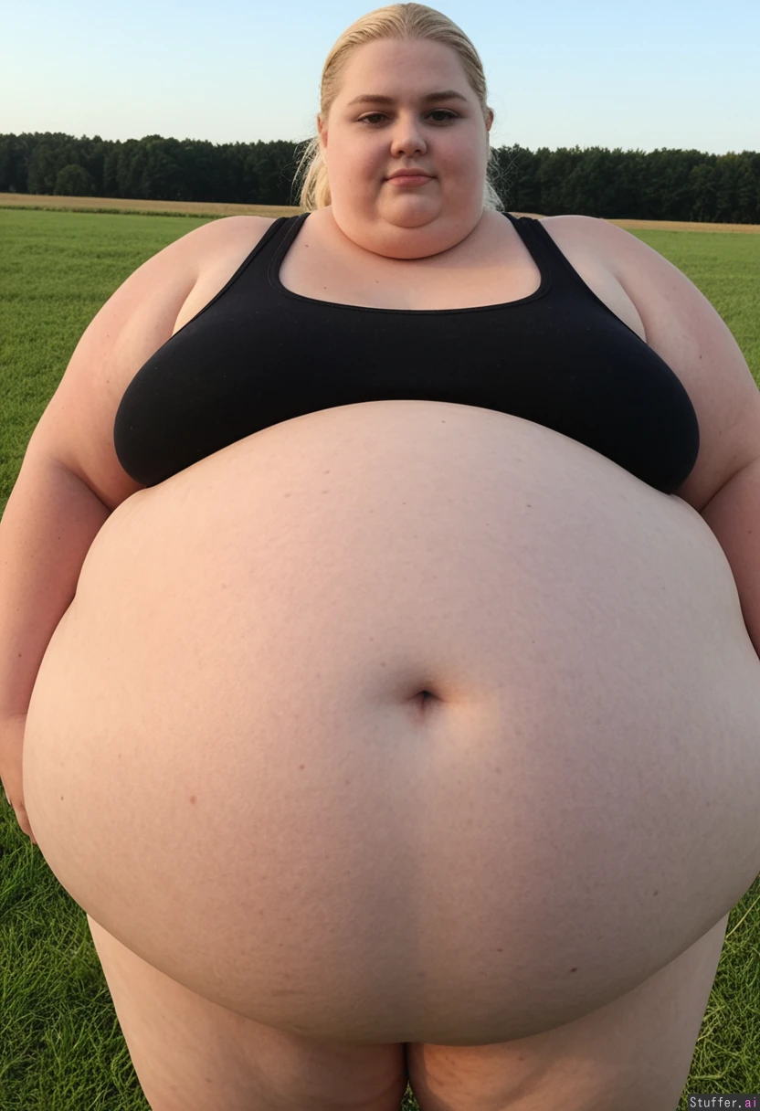 (Hyper Obese:2.4) woman with super fat curvy body and (small breasts) Long blonde Ponytail, Model Face Standing with fields in background Wearing black thong and black tank top with cleavage showing, (wide hips:), (fat belly:), (gigantic_belly:), (gaint blob of a woman:1.8)