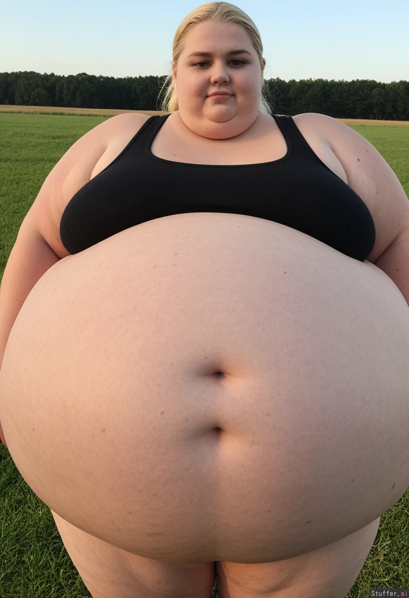 (Hyper Obese:2.4) woman with super fat curvy body and (small breasts) Long blonde Ponytail, Model Face Standing with fields in background Wearing black thong and black tank top with cleavage showing, (wide hips:), (fat stuffed belly:), (gigantic_belly:), (gaint blob of a woman:1.8)
