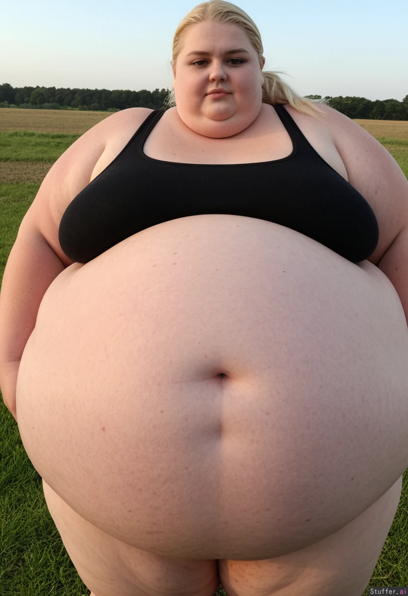 (Hyper Obese:2.4) woman with super fat curvy body and (small breasts) Long blonde Ponytail, Model Face Standing with fields in background Wearing black thong and black tank top with cleavage showing, (fat belly:), (gigantic_belly:), (gaint blob of a woman:1.7)