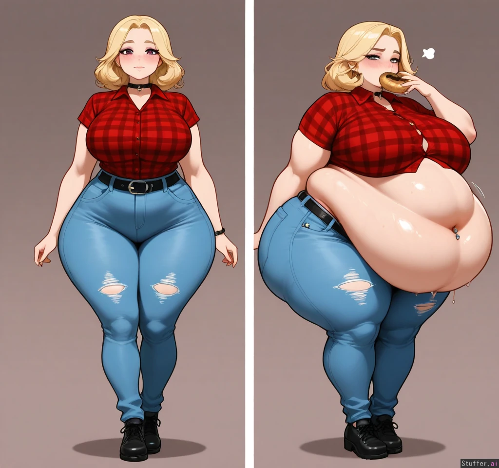 (1 girl), stunning beauty, gorgeous, ((sexy pose)) ((eyeliner)), short blonde hair, bangs, maroon eyes, (blushing), choker, ((thick thighs, thick body, wide belly, fat muffintop, bbw)), (donut in mouth), ((mature, adult)), (kittew(artist)), (high waist thick thong showing), (navel piercing), ((punk)), blushyspicy(artist), standing, basic background, dark circles under eyes, (((red plaid collared shirt))), shirt button gaps, (jeans, belt), full body profile view, eating donuts, (Slim Thick to extremely fat weight gain) (((Thickest, fuller hips, fat arms, super wide love handles, gigantic bloated flabby hyper belly growth, plus size, fat frame, plus size bbw))), perfect eyes,( Embarrassed about her weight, thong snug), Ripped jeans, (Extreme Weight gain before and after), sequence, stretch marks, outgrowing clothes, embarrassed, girlfriend growing fatter