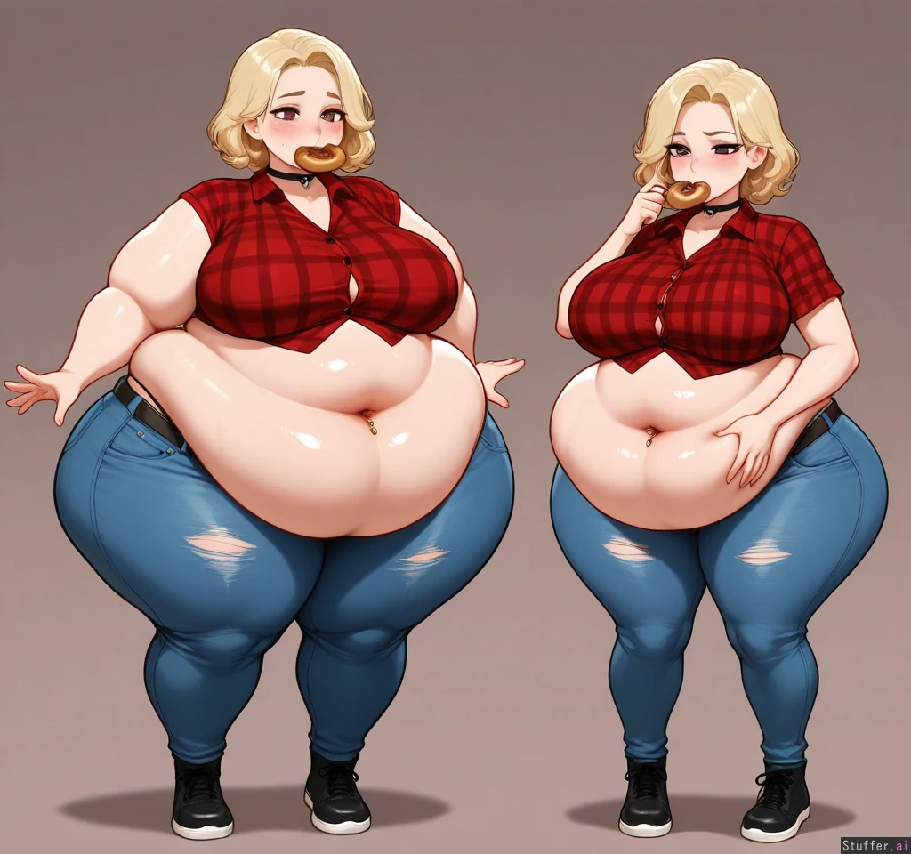 (1 girl), stunning beauty, gorgeous, ((sexy pose)) ((eyeliner)), short blonde hair, bangs, maroon eyes, (blushing), choker, ((thick thighs, thick body, wide belly, fat muffintop, bbw)), (donut in mouth), ((mature, adult)), (kittew(artist)), (high waist thick thong showing), (navel piercing), ((punk)), blushyspicy(artist), standing, basic background, dark circles under eyes, (((red plaid collared shirt))), shirt button gaps, (jeans, belt), full body profile view, eating donuts, (Thick fat to extremely obese immobile weight gain) (((Thickest, fuller hips, fat arms, super wide love handles, gigantic bloated flabby hyper belly growth, plus size, fat frame, plus size bbw))), perfect eyes,( Embarrassed about her weight, thong snug), Ripped jeans, (Extreme Weight gain before and after), sequence, stretch marks, outgrowing clothes, embarrassed, girlfriend growing fatter