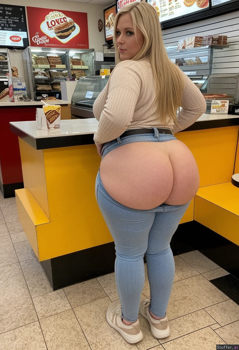 Fully dressed, long blonde hair, blue eyes, 33 years old woman wearing too tight, light blue high waist jeans,beige sweater, Sneakers, Chubby, the day after overeating, she has chubby legs, meaty rump, wide hips, Ass packed tightly into her Jeans, Love handles, belt, entering a fast food place
