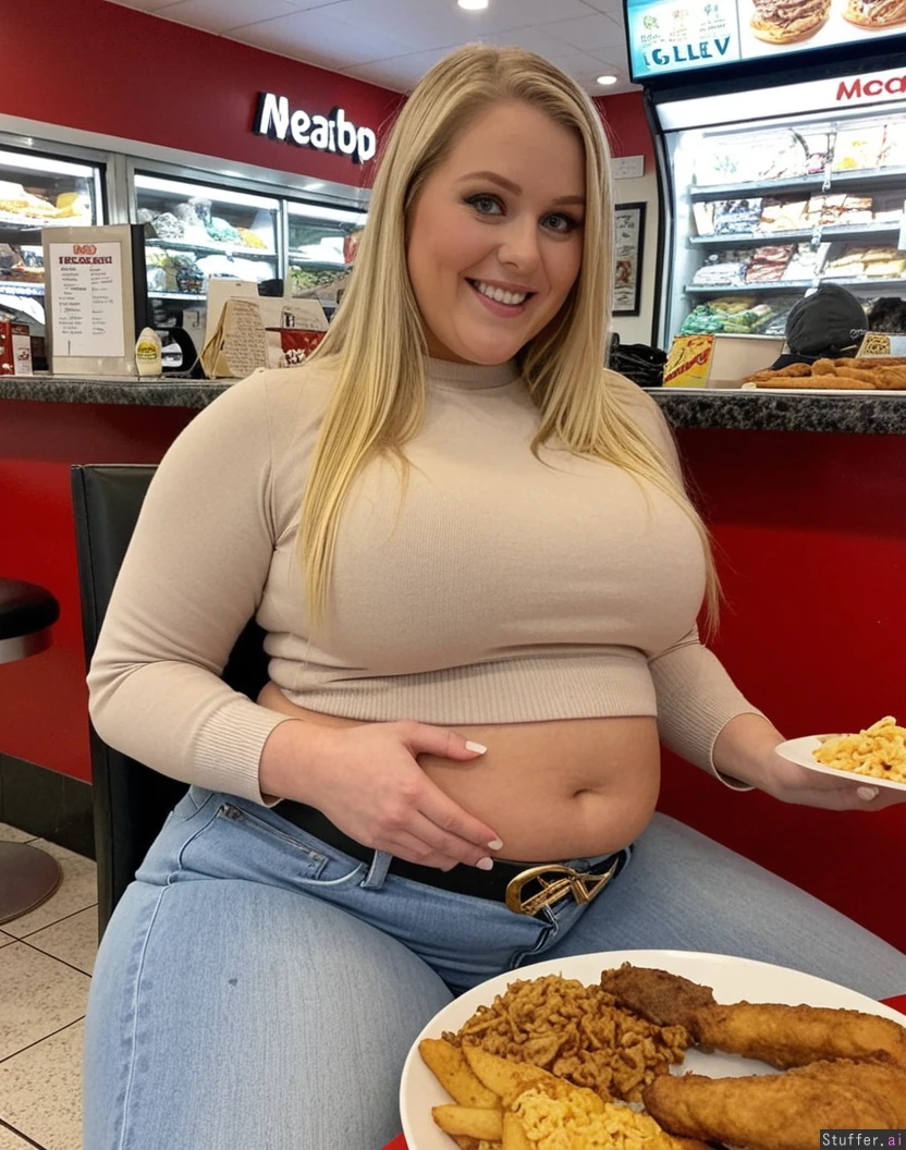 long blonde hair, blue eyes, 33 years old, tall wide woman wearing too tight, light blue high waist jeans, beige sweater, chubby legs, meaty rump, wide hips, belly belt, Shopping, sitting a fast food place, a huge Plate full of fried food right in Front of her, she Looks Happy and turned on from eating