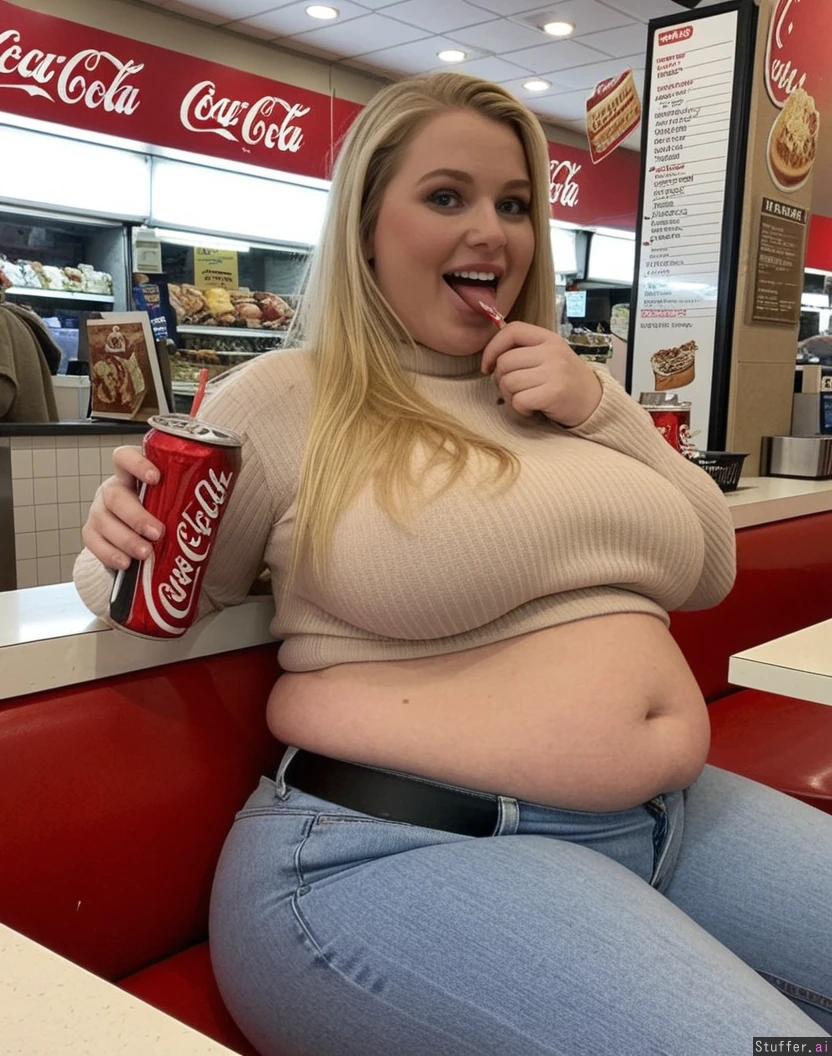 long blonde hair, blue eyes, 33 years old, tall wide woman wearing too tight, light blue high waist jeans, beige sweater, chubby legs, meaty rump, wide hips, belly belt, Shopping, sitting a fast food place, drinking a giant Coke, she Looks Happy and turned on from eating, her fat Body growing with every bite