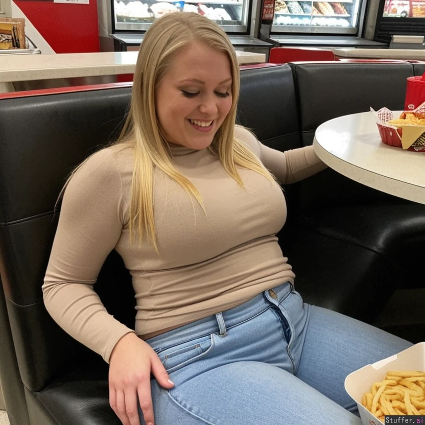 long blonde hair, blue eyes, 33 years old, tall wide woman wearing too tight, light blue high waist jeans, beige sweater, chubby legs, meaty rump, wide hips, belly belt, Shopping, sitting a fast food place, finishing her meal, she Looks Happy and turned on from being full and fat, sitting at the table, her fat spilling everywhere, enjoying the tightness of her pants, eyes closed
