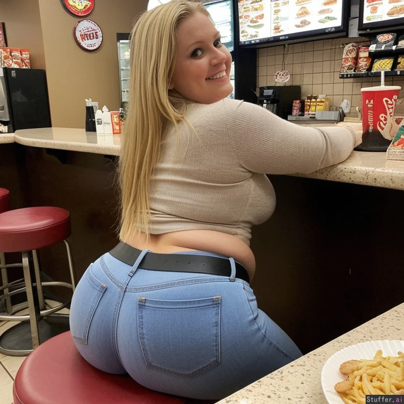 long blonde hair, blue eyes, 33 years old, tall wide woman wearing too tight, light blue high waist jeans, beige sweater, chubby legs, meaty rump, wide hips, belly belt, Shopping, sitting a fast food place, Standing up from her Finished meal, she Looks Happy and turned on from being full and fat, her Belly touches the table, Butt too tight to fit through, her fat spilling everywhere, enjoying the tightness of her pants, looking content, turning her head to Take a loke at her huge ass, the belt Cuts into her fat everywhere