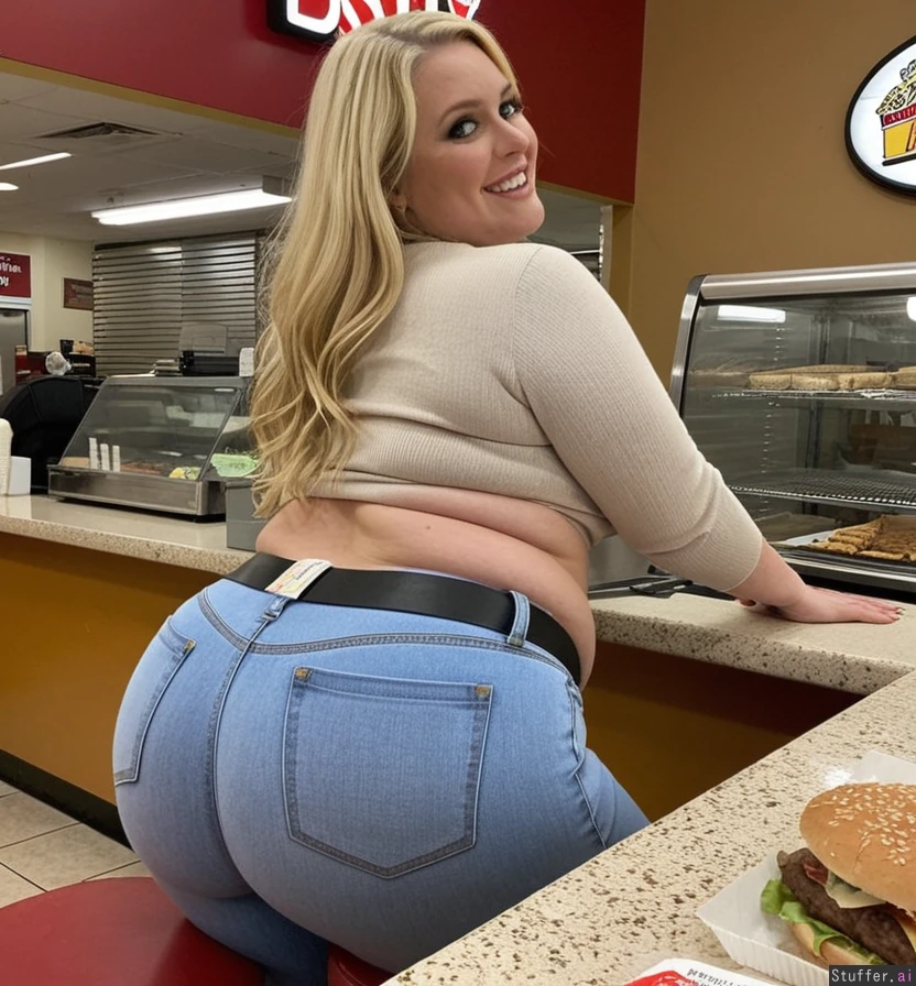 long blonde hair, blue eyes, 33 years old, tall wide woman wearing too tight, light blue high waist jeans, beige sweater, chubby legs, meaty rump, wide hips, belly belt, Shopping, sitting a fast food place, Standing up from her Finished meal, she Looks Happy and turned on from being full and fat, her Belly touches the table, Butt too tight to fit through, her fat spilling everywhere, enjoying the tightness of her pants, looking content, turning her head to Take a loke at her huge ass, the belt Cuts into her fat everywhere, the Chef Brings her a giant burger