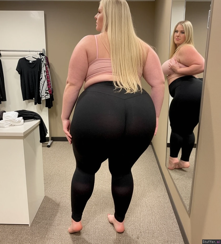 long blonde hair, blue eyes, 33 years old, tall wide woman, trying on tight Leggings in the Dressing room, enormous legs, bbw, wide hips, massive ass