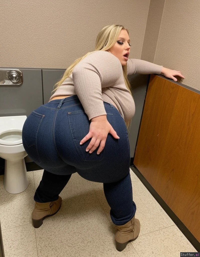 Full body shot, long blonde hair, blue eyes, 33 years old, tall wide woman, at the office restroom, wearing too tight Dark Grey Jeans and a beige sweater, boots, enormous legs, bbw, wide hips, massive ass, she ist pushing her right Hand into her own tight pants from above, to Touch herself Out of lust, masturbate, pleasurrs from being overeaten, she gets an orgasm from grabbing her own fat, squirting INSIDE her too tight pants