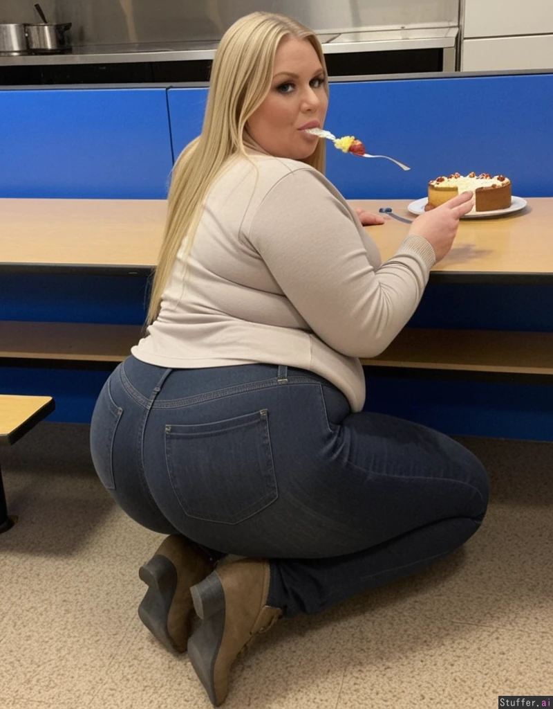 Full body shot, long blonde hair, blue eyes, 33 years old, tall wide woman, Sitting at the cafeteria , wearing too tight, Dark Grey Jeans and a beige sweater, boots, enormous legs, bbw, wide hips, massive ass, eating three meals and a piece of cake Like a fat pig