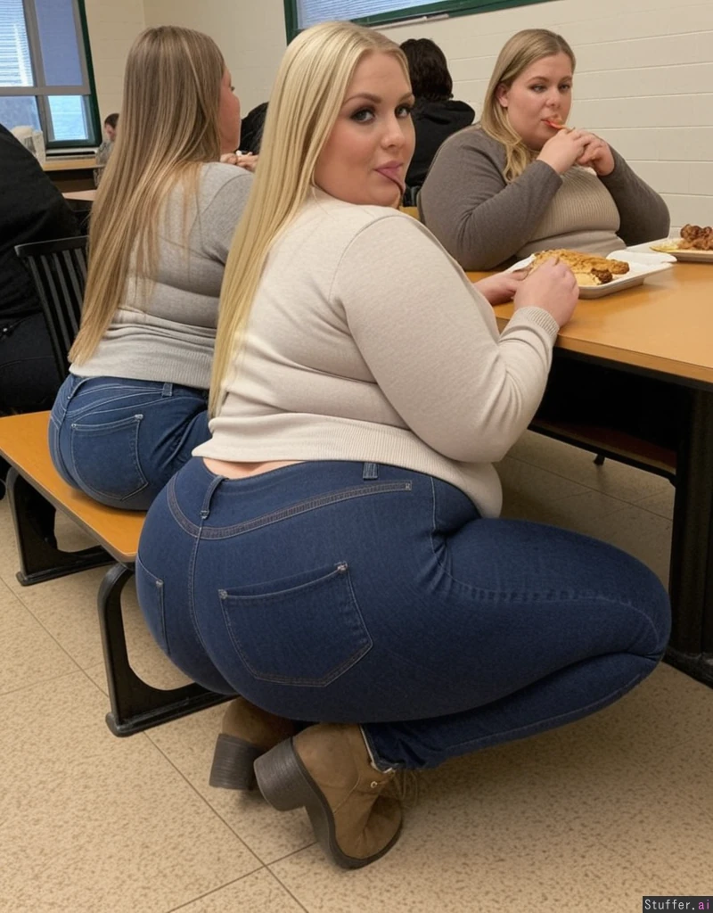 Full body shot, long blonde hair, blue eyes, 33 years old, tall wide woman, Sitting at the cafeteria with other people, wearing too tight, Dark Grey Jeans and a beige sweater, boots, enormous legs, bbw, wide hips, massive ass, eating three meals with meat Like a fat pig