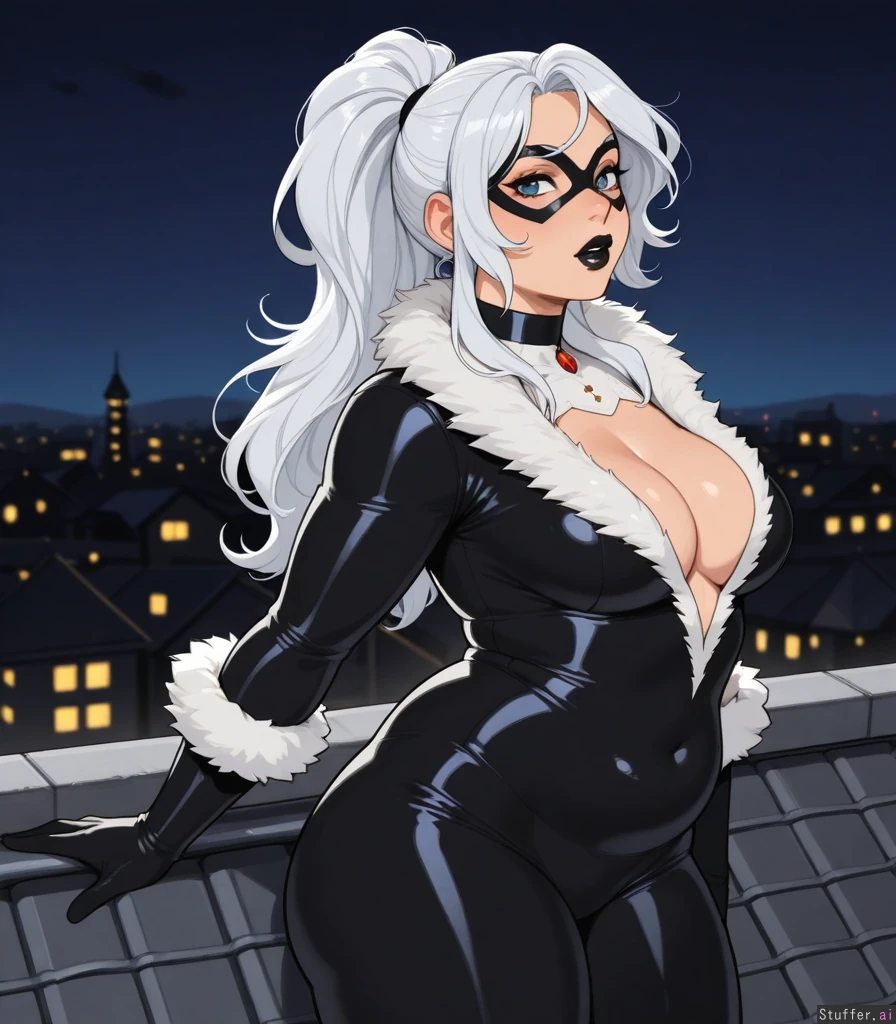 Solo, KAMII MOMORU(artist), ((Felicia Hardy, white hair, ponytail, eyemask)), horny, ((tight black and grey bodysuit, deep cleavage)), ((alt girl, black lipstick, plump lips)), small breasts, ((thick, chubby:1.2)), (serious face), (sexy pose, sexy), thick thighs, round belly, standing, on roof, night, medium breasts, Dramatic lighting, ((looking at viewer))