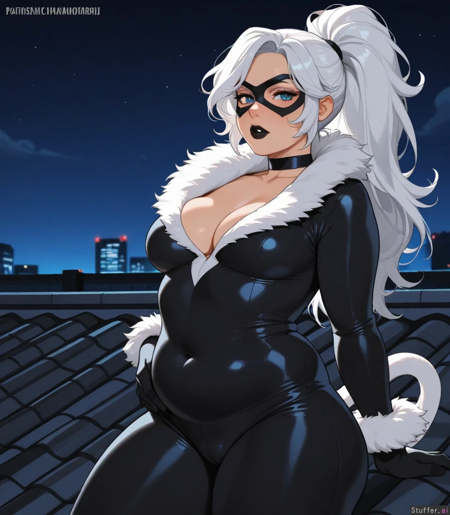 Solo, KAMII MOMORU(artist), ((Felicia Hardy, white hair, ponytail, eyemask)), horny, ((tight black and grey bodysuit, deep cleavage)), ((alt girl, black lipstick, plump lips)), small breasts, ((thick, chubby:1.2)), (serious face), (sexy pose, sexy), thick thighs, round belly, standing, on roof, night, medium breasts, Dramatic lighting, ((looking at viewer))