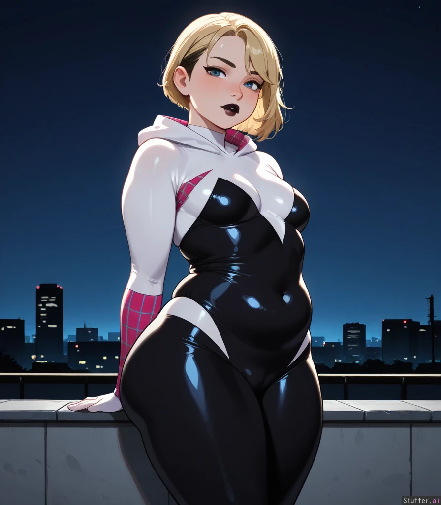 Solo, KAMII MOMORU(artist), ((gwen stacy)), horny, ((tight bodysuit)), ((alt girl, black lipstick, plump lips)), small breasts, ((thick, chubby:1.2)), (serious face), (sexy pose, sexy), thick thighs, round belly, standing, on roof, night, medium breasts, Dramatic lighting, ((looking at viewer))