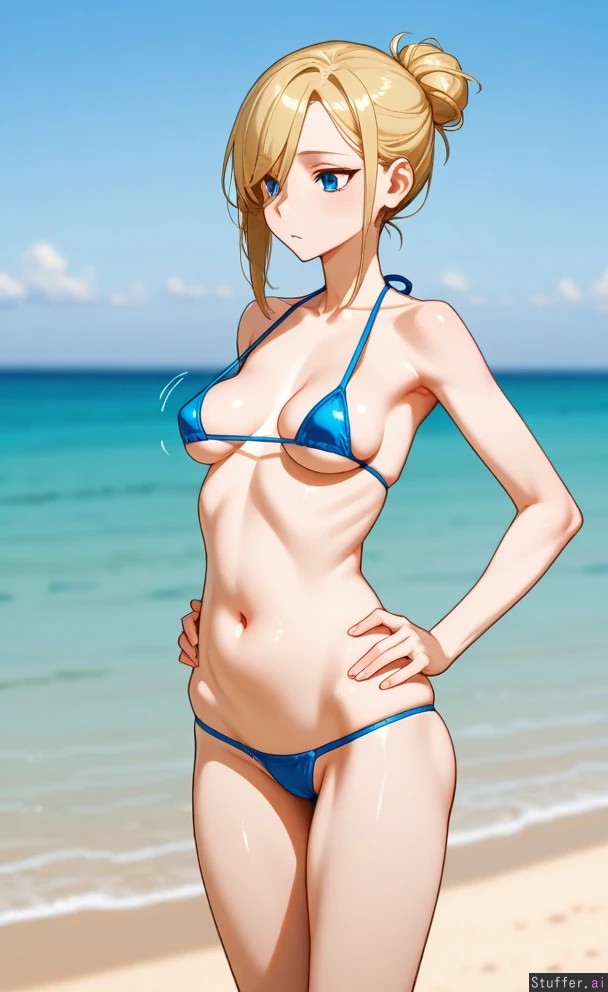 Solo, adult woman, milf, Highres, (milf:1), (blue eyes), blonde hair, voluminous hair, highbun, (beach), hair_over_one_eye, blue micro bikini, wider hips, hands_on_hips, (slim figure:1.9), (breasts:1.0), (overweight:1.0), (hips:1.1), (butt:1.0), (chubby belly:1.0), (thick thighs:1.1), (Weight gain:1.3), (breast expansion:1.3),