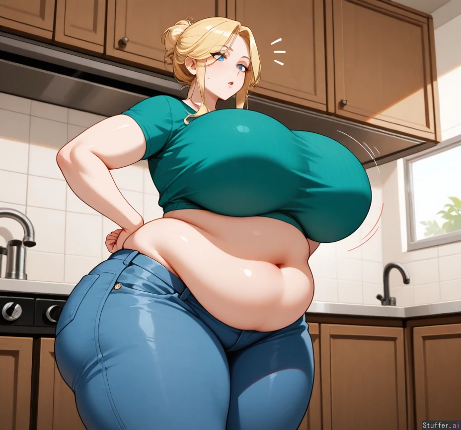 Solo, adult woman, milf, Highres, (milf:1), (blue eyes), blonde hair, voluminous hair, highbun, (kitchen), hair_over_one_eye, crop top, jeans, wider hips, hands_on_hips, (slim figure:1.0), (breasts:1.1), (overweight:1.1), (hips:1.1), (butt:1.1), (chubby belly:1.1), (thick thighs:1.1), (Weight gain:1.1), (breast expansion:1.1),