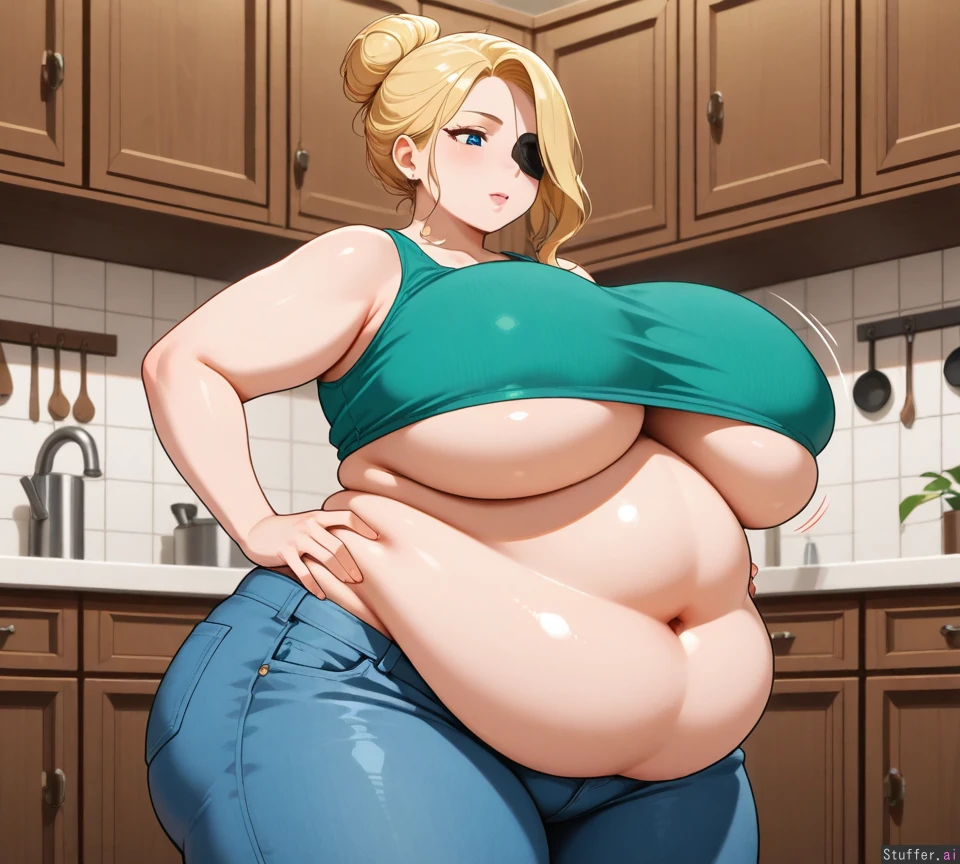Solo, adult woman, milf, Highres, (milf:1), (blue eyes), blonde hair, voluminous hair, highbun, (kitchen), hair_over_one_eye, crop top, jeans, wider hips, hands_on_hips, (slim figure:1.0), (breasts:1.5), (overweight:1.3), (hips:1.0), (butt:1.0), (chubby belly:1.2), (thick thighs:1.0), (Weight gain:1.1), (breast expansion:1.1), underboob