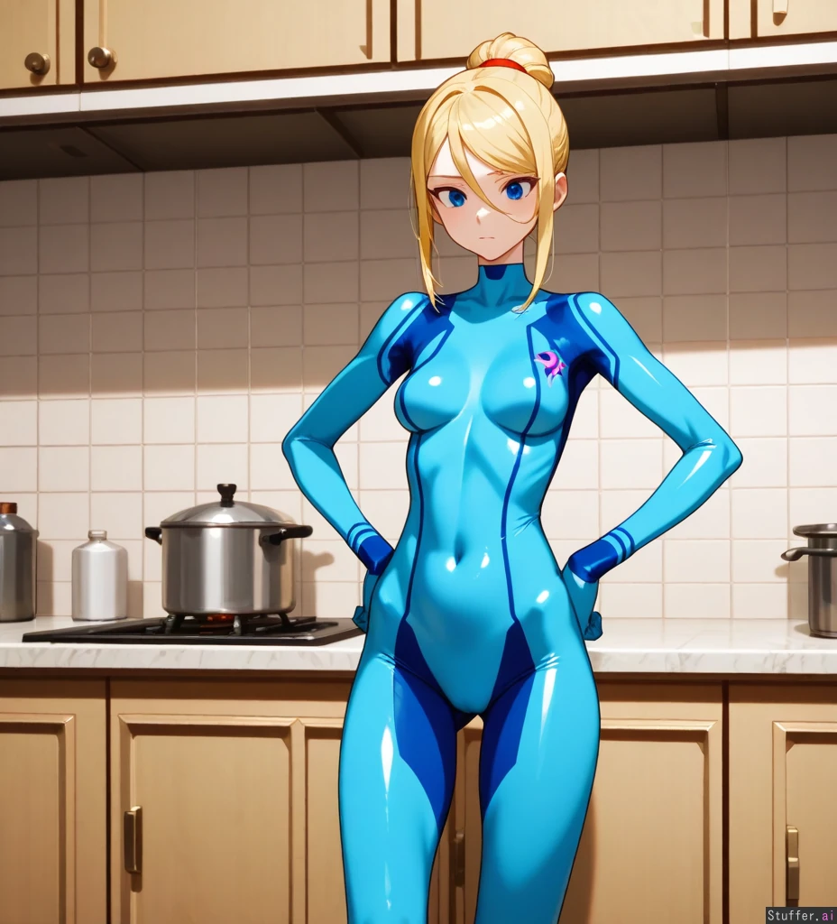 Solo, adult woman, milf, Highres, (milf:1), (blue eyes), blonde hair, voluminous hair, highbun, (kitchen), hair_over_one_eye, zero suit samus, blue bodysuit, wider hips, hands_on_hips, (slim figure:1.8), (breasts:1.0), (overweight:1.0), (hips:1.0), (butt:1.0), (chubby belly:1.0), (thick thighs:1.0), (Weight gain:1.1), (breast expansion:1.1),