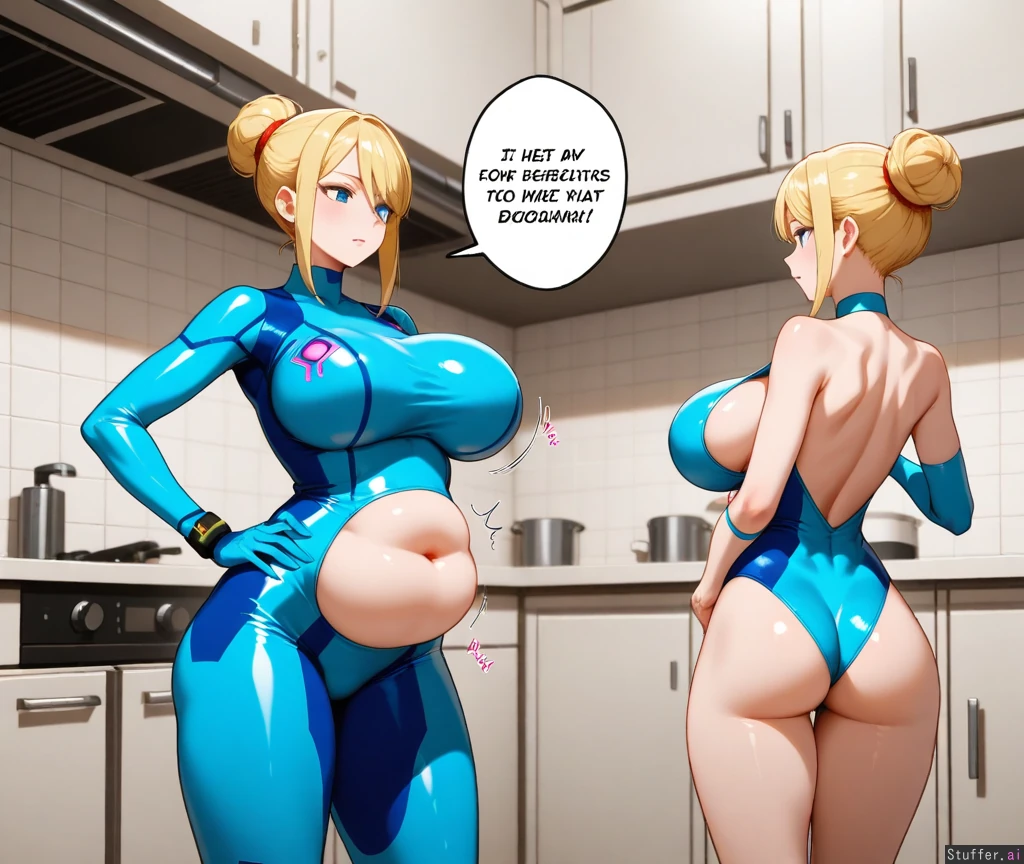 Solo, adult woman, milf, Highres, (milf:1), (blue eyes), blonde hair, voluminous hair, highbun, (kitchen), hair_over_one_eye, zero suit samus, blue bodysuit, wider hips, hands_on_hips, (slim figure:1.5), (breasts:1.2), (overweight:1.1), (hips:1.1), (butt:1.0), (chubby belly:1.1), (thick thighs:1.1), (Weight gain:1.2), (breast expansion:1.3),