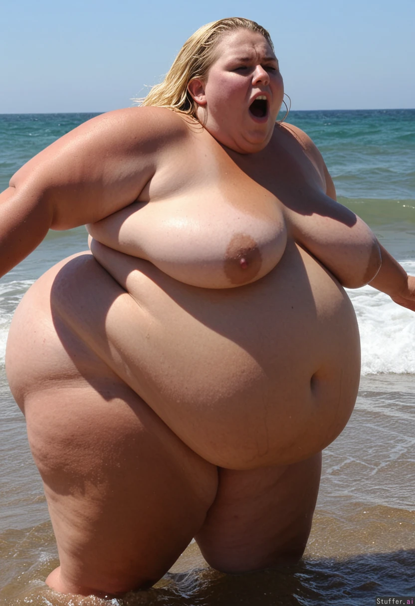 (Hyper_obese:1.4) Cute tan 29-yrs-old polish USSBBW hyper-blob ((Huge body)) Humongous, extremely obese 200kg insatiable female ((Bending over)) on the empty ocean beach Struggles with her massive belly trying to lean forward Blonde wet messy flowing hair Perky breasts hard nipples Gluttonous fatty who ate so much that rapidly fattened herself into gigantic immobile hyper-blob, too fat to stand, soaked in water ((Screaming and moaning)) she is cumming (((Intensely orgasming))) most intense mind-blowing orgasm ever