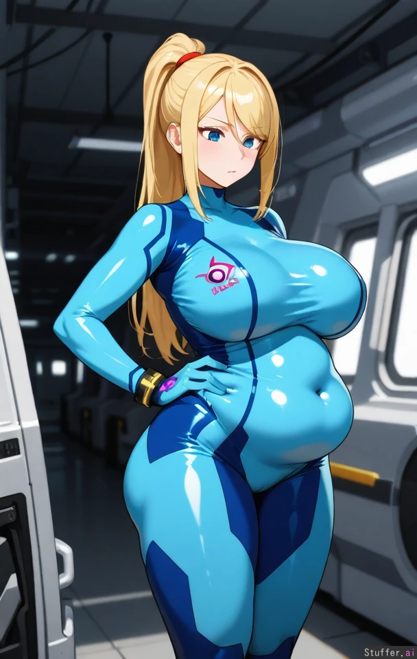 Solo, adult woman, milf, Highres, (milf:1), (blue eyes), blonde hair, voluminous hair, highbun, (spaceship), hair_over_one_eye, zero suit samus, blue bodysuit, wider hips, hands_on_hips, (slim figure:1.5), (breasts:1.2), (overweight:1.1), (hips:1.1), (butt:1.0), (chubby belly:1.0), (thick thighs:1.1), (Weight gain:1.2), (breast expansion:1.2),