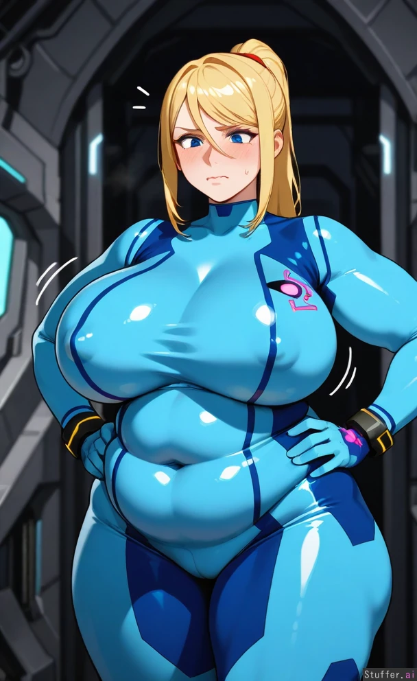 Solo, adult woman, milf, Highres, (milf:1), (blue eyes), blonde hair, voluminous hair, highbun, (spaceship), hair_over_one_eye, zero suit samus, blue bodysuit, wider hips, hands_on_hips, erect nipples, embarrassed, tearing bodysuit (slim figure:1.4), (breasts:1.4), (overweight:1.3), (hips:1.3), (butt:1.0), (chubby belly:1.3), (thick thighs:1.2), (puffy face:1.2), (fat arms:1.2) (Weight gain:1.3), (breast expansion:1.2),