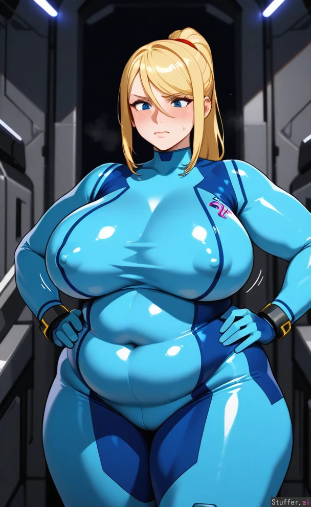 Solo, adult woman, milf, Highres, (milf:1), (blue eyes), blonde hair, voluminous hair, highbun, (spaceship), hair_over_one_eye, zero suit samus, blue bodysuit, wider hips, hands_on_hips, erect nipples, embarrassed, tearing bodysuit (slim figure:1.35), (breasts:1.4), (overweight:1.4), (hips:1.3), (butt:1.0), (fat chubby belly:1.3), (thick thighs:1.2), (puffy face:1.2), (fat arms:1.2) (Weight gain:1.3), (breast expansion:1.2),