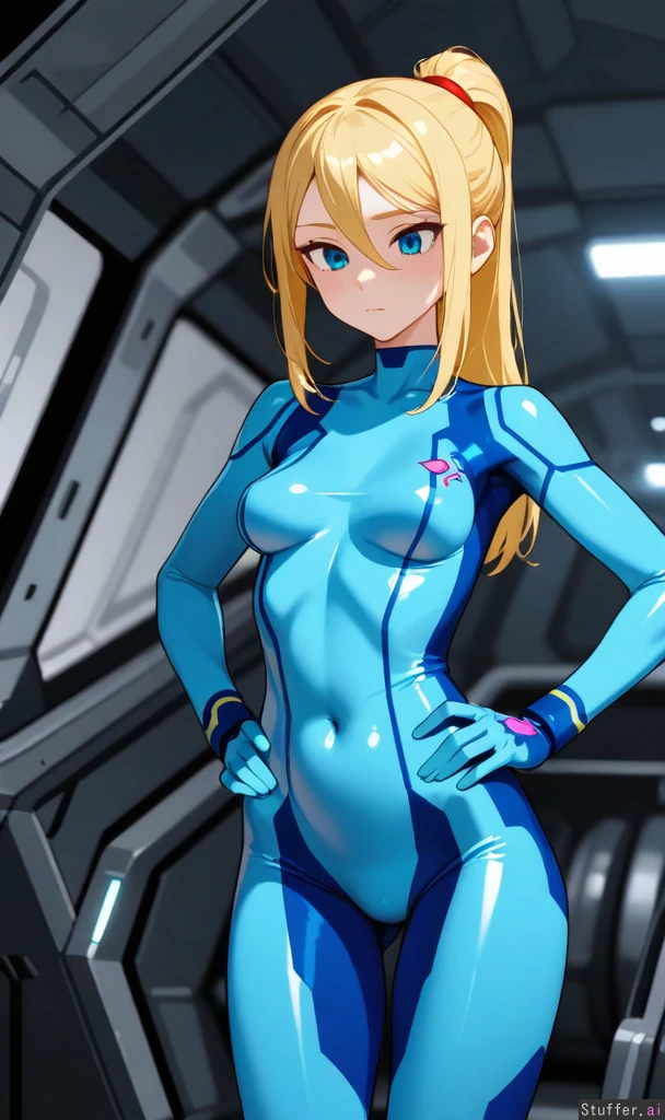 Solo, adult woman, milf, Highres, (milf:1), (blue eyes), blonde hair, voluminous hair, highbun, (spaceship), hair_over_one_eye, zero suit samus, blue bodysuit, wider hips, hands_on_hips, (slim figure:1.8), (breasts:1.0), (overweight:1.0), (hips:1.0), (butt:1.0), (chubby belly:1.0), (thick thighs:1.0), (Weight gain:1.1), (breast expansion:1.1),