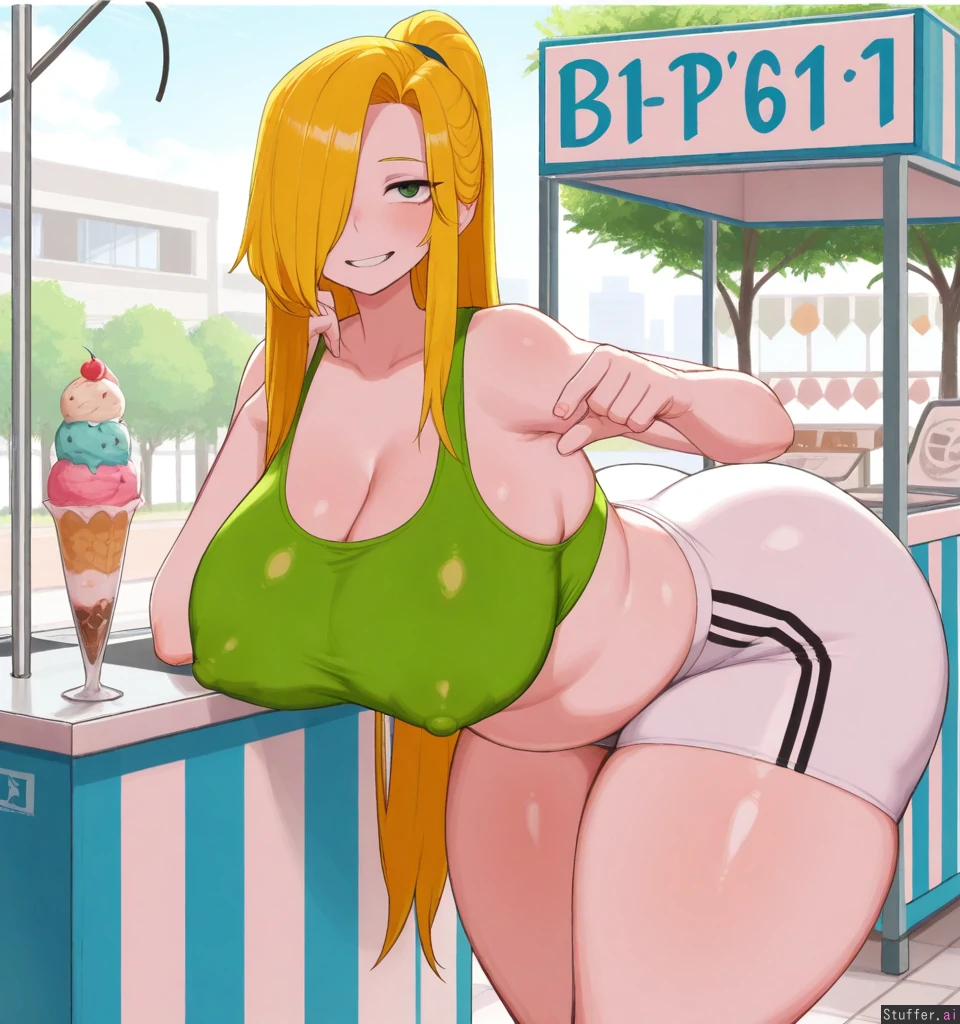 absurdres, 8k, perfect anatomy, masterpiece, beautiful face, beautiful eyes, RockSolidArt(artist/), (merunyaa), (usa37107692:1.2), (ohasi_art:1.2), (betterwithsalt), cute, ((mature)), ((one girl)), (alone), puffy nipples, (covered nipples, erect nipples), (Blonde, green eyes, long hair, straight hair, ponytail, hair_over_left_eye), (Outside, park), ((Green sports bra, white spandex shorts)), (Standing), (looking at viewer), (pointing to ice cream stand), (Grin), (disproportionately big legs and ass, gigantic oversized thick thighs, gigantic hyper wide hips, gigantic fat ass), (huge thighs, fat legs, obese),